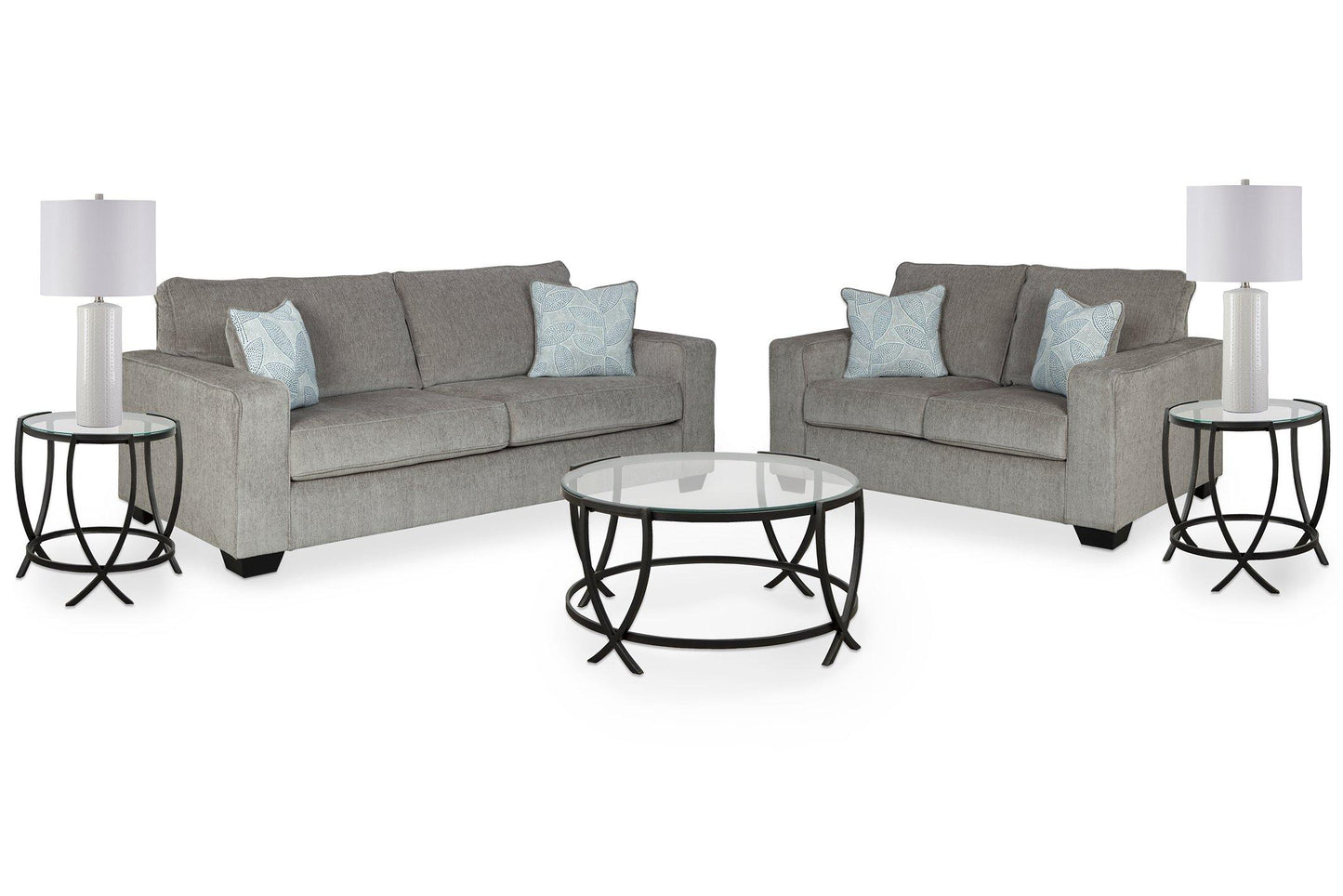 If style is the question, then this room package is the answer. The sofa and loveseat feature clean lines and sleek track arms enhanced with plump cushioning and a chenille-feel upholstery. A clear winner for lovers of contemporary style, the coffee table and end tables make a brilliant impression with a metal arc X-motif. Two ceramic table lamps have bases teeming with texture, proving that a monochromatic design can be visually interesting.