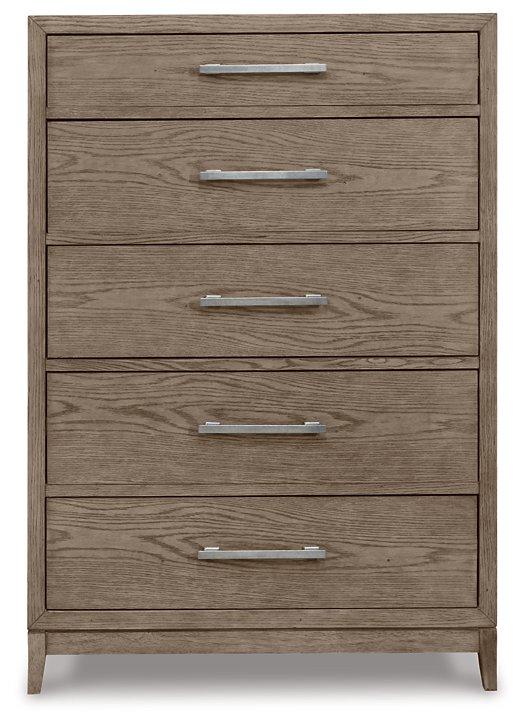 You want your room to reflect your refined sensibilities while remaining forward-thinking in design. The simple silhouette of this chest of drawers opens the door to a bedroom with the curated look and subtle flair you desire. Striking metal bar pulls in a light pewter tone are functionally fashionable against the piece's elegant waxy gray finish. Ample drawer space allows you to store in streamlined style.