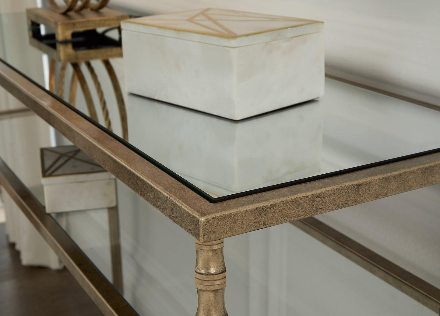 This sofa table gives traditional design a wonderful sense of relevance. Its details, which include embellished legs and a stretcher with a decorative center finial, are timeless classics. The aged goldtone coloration is the essence of relaxed elegance. An underlying shelf adds style, substance and functionality.