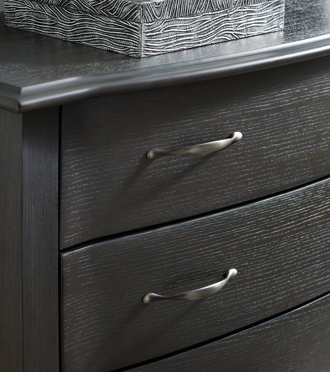 - Metal drawer pulls with silvertone finish