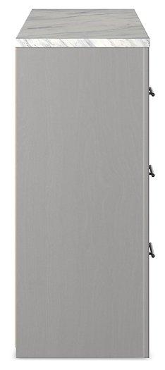 Cool, clean and casually modern. This dresser’s wispy dove gray finish and faux Calcutta marble top set the tone for your calming sanctuary. Large linear pulls add dimension and authenticity. Six smooth-gliding drawers neatly accommodate your wardrobe needs.