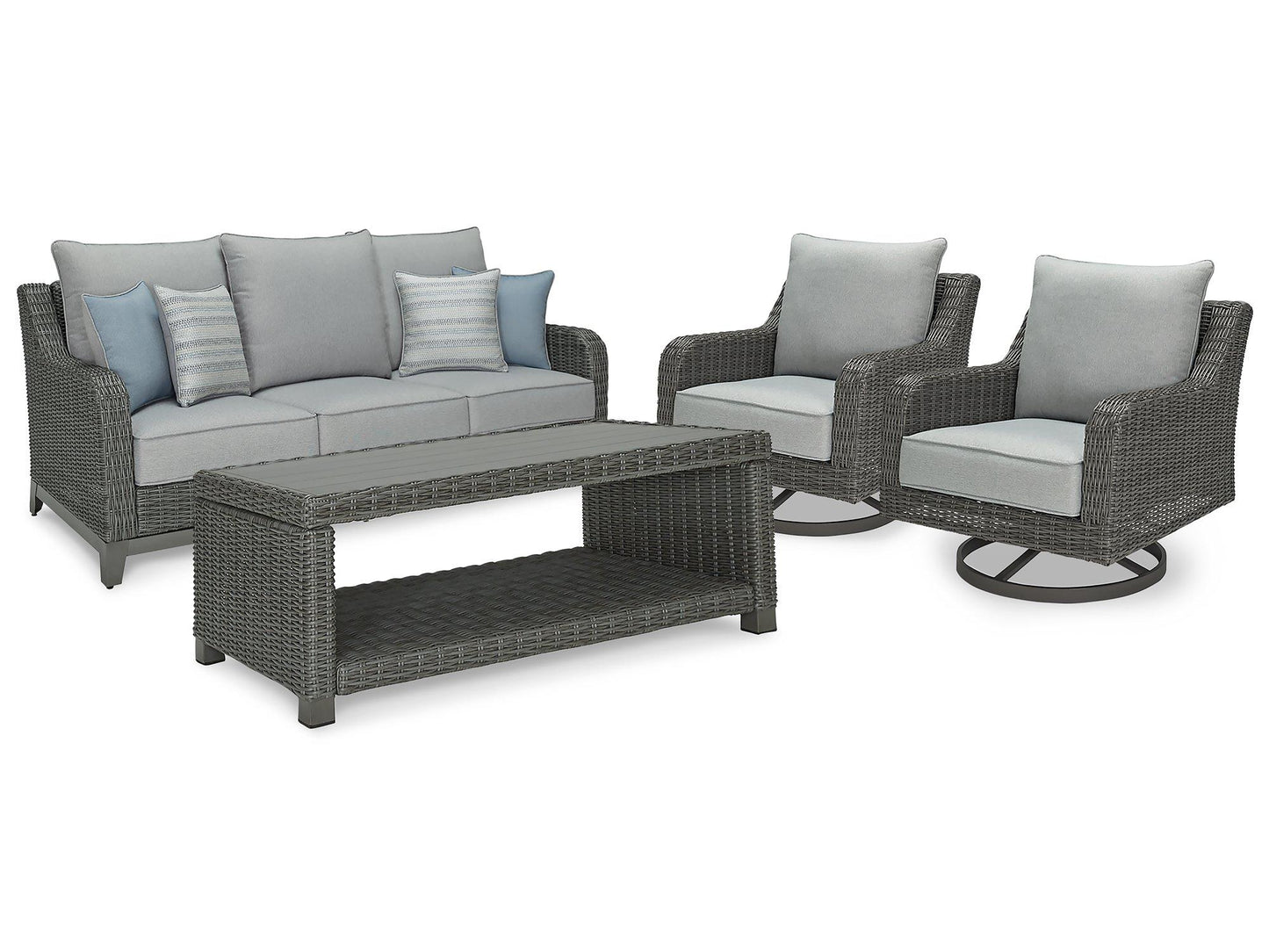 Add a distinguished touch of gray to your outdoor living space with this sofa with table and chairs package. It's made with resin wicker over an aluminum frame for a relaxed look that provides seasons of enjoyment. Rest assured, the thick seat and back cushions are wrapped in our exclusive Nuvella® high-performance fabric that’s fade-resistant, stain-resistant and a breeze to clean.