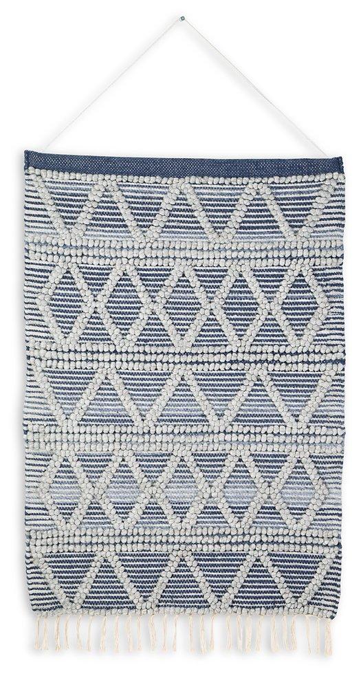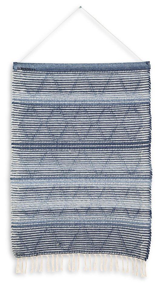 With boho-chic design in mind, this woven wall hanging adds eye-catching texture to your living space. Its diamond design, decorative fringe trim and shades of blue and gray will add interest to your wallscape, inside or out.
