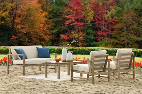 With its sleek lines, gorgeous driftwood tone and cushioned comfort, this 4-piece outdoor set with table set can make your outdoor space feel more like an upscale resort. Made for looks and longevity, this high-quality ensemble is built from eucalyptus wood treated to a deluxe embossed finish to brave the elements. The thick, all-weather seat cushion and back pillow are wrapped in a delightfully neutral Nuvella® fabric that’s a breeze to clean. Pair of throw pillows add a coastal cool touch.