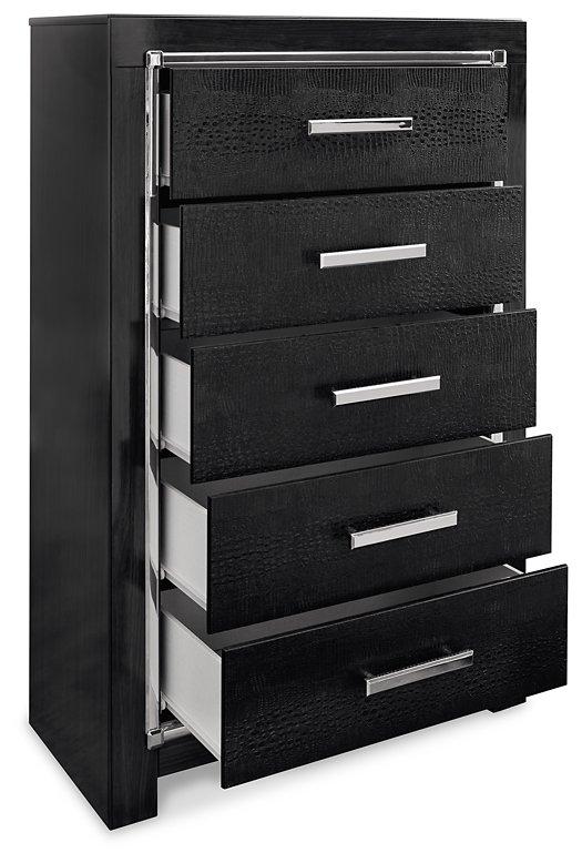 - 5 smooth-gliding drawers with faux linen lining and large chrome-tone pulls with faceted details