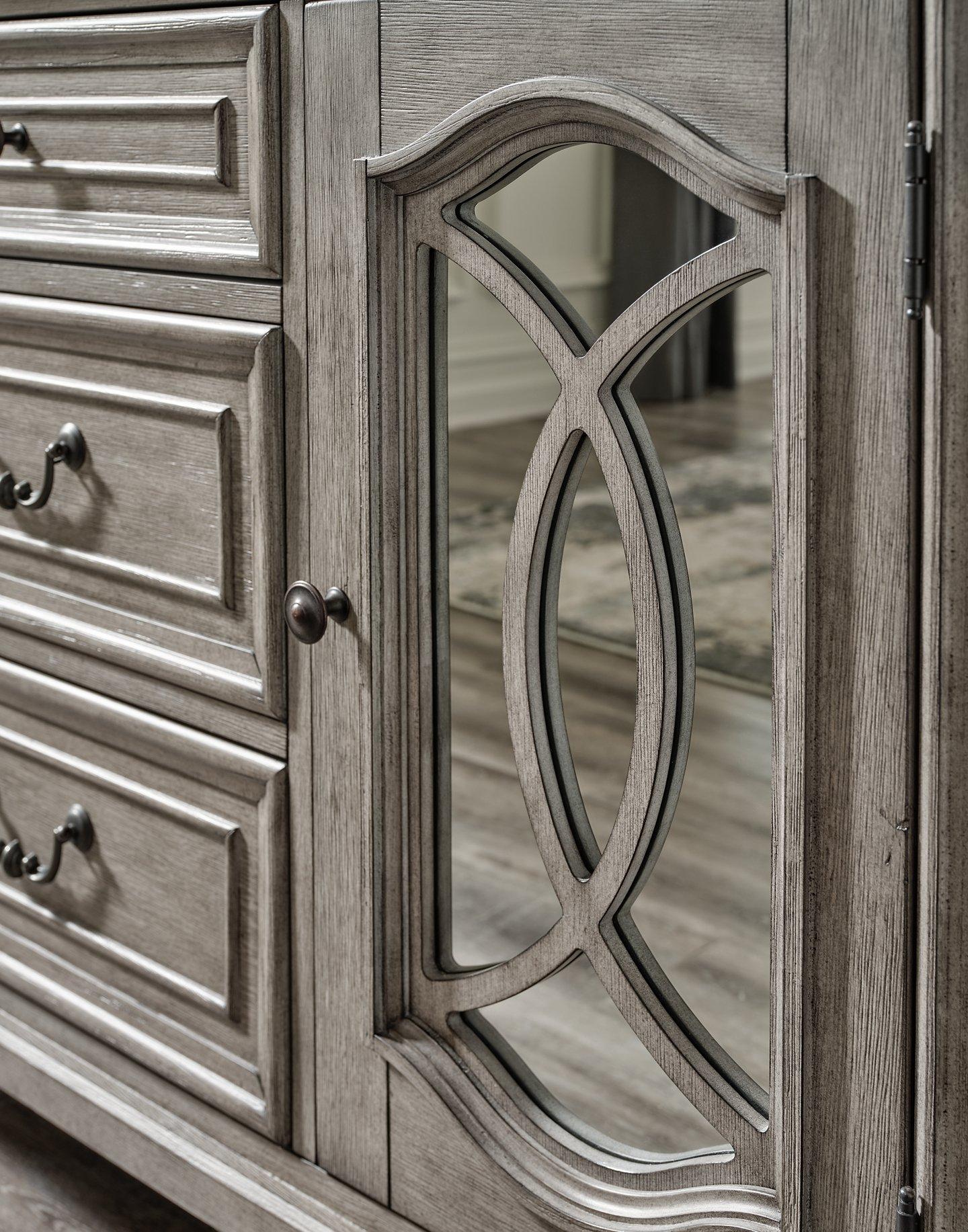Serve up a sense of traditional cottage design with this dining room server. It features a pair of cabinet doors with inset mirrored glass and decorative fretwork. The server's three smooth-gliding drawers with dovetail construction and black felt bottoms are perfect for storing more delicate items. An antiqued gray body and rich deep walnut brown top, along with bail pulls and knobs finished in a dark bronze tone, complete the beautiful design.