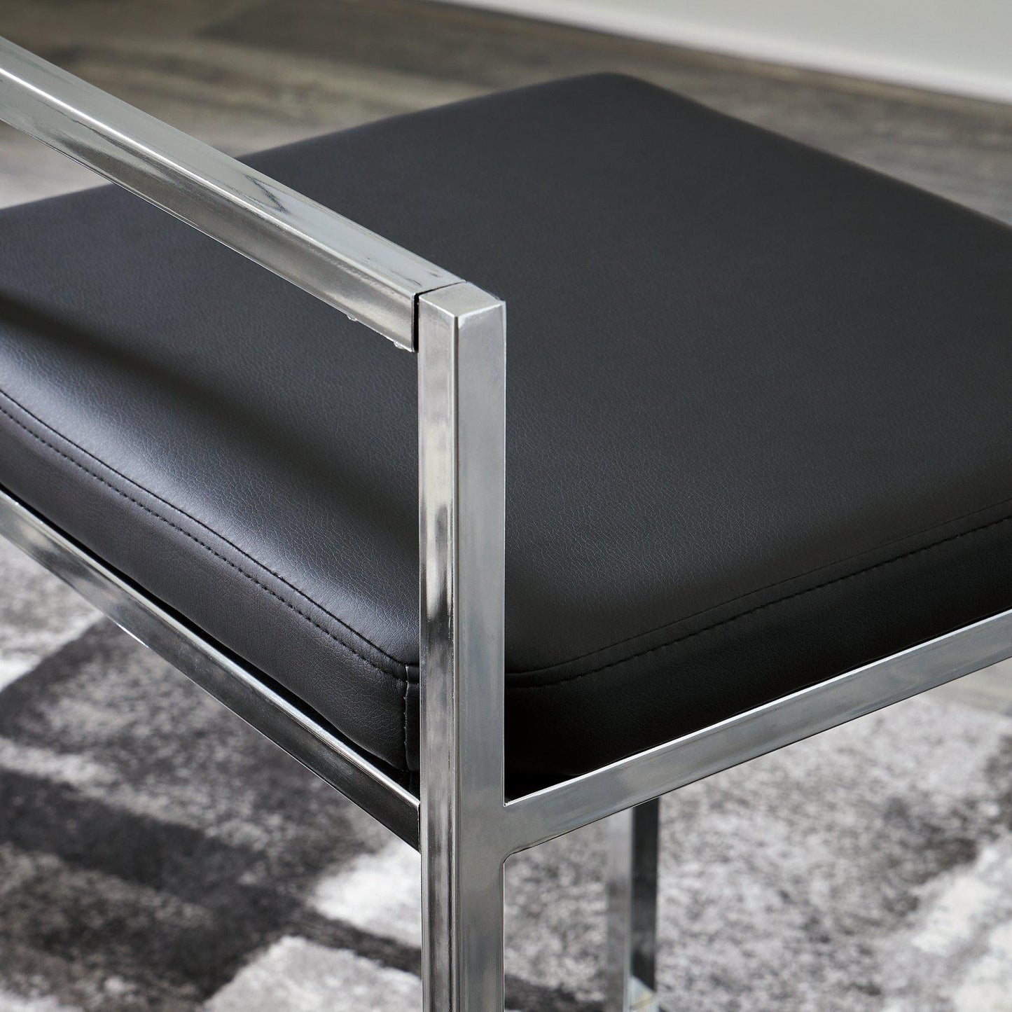 Wowing with a slim but sturdy profile and sculptural design, this bar stool is sure to whet your appetite for ultra-contemporary style. Its comfortably cushioned seat is covered in a fabulous black faux leather, while the metal frame's chrome-tone finish provides visual contrast.