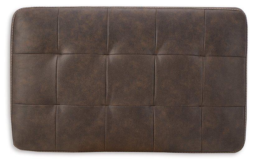 If you love the idea of a luxe look that won't break the bank, make yourself comfortable with this alluring walnut brown ottoman. Designed to look like the real thing, it's wrapped in a practical faux leather loaded with natural tonal variation and a soft hand feel. The ottoman is dressed to impress with jumbo stitching, tufted details and wide block feet for a clean-lined, modern touch that appeals to a contemporary taste.