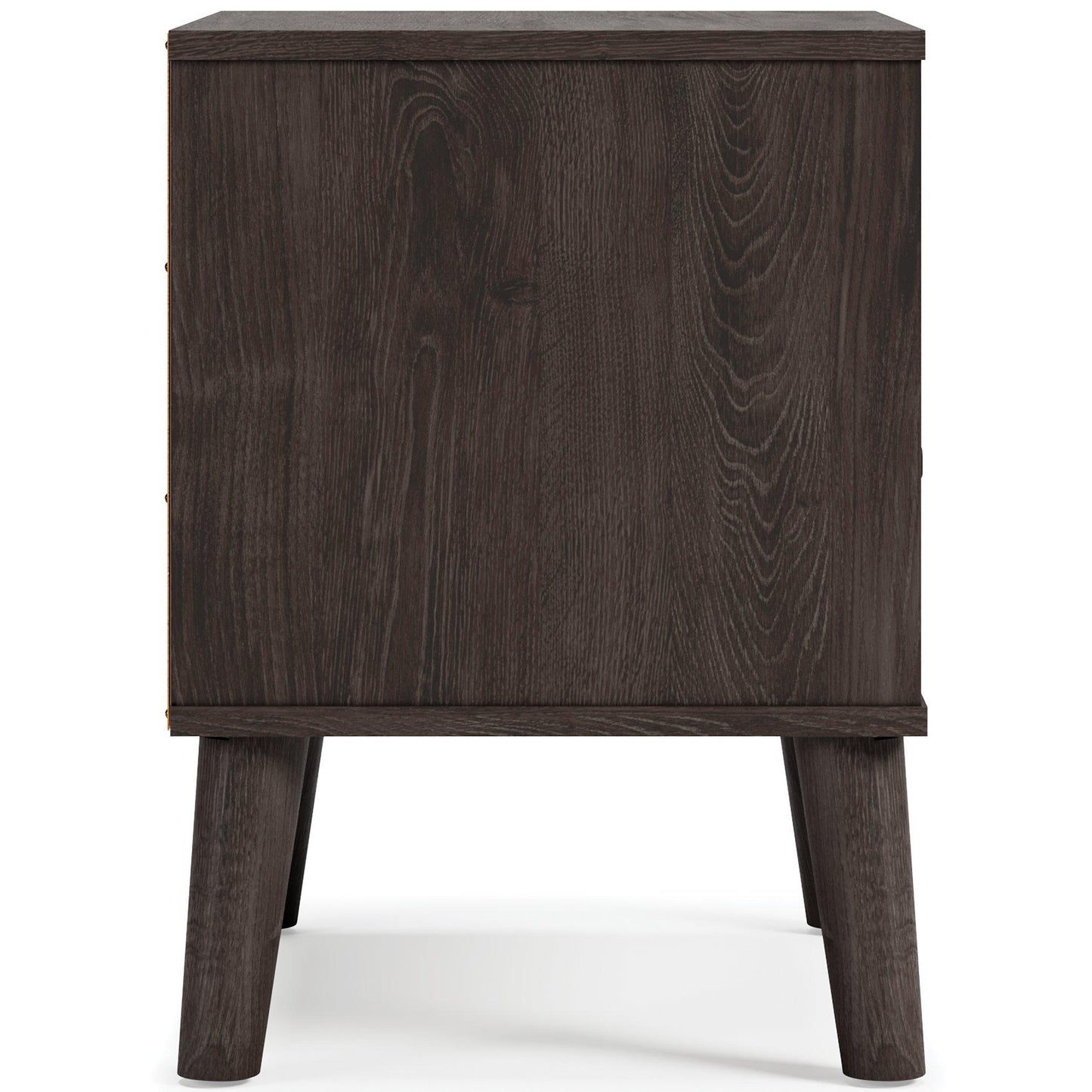 The perfect marriage of contemporary and casual style, this nightstand is a charming addition to your home. It features an expressive two-toned look, with a dark charcoal finish over replicated oak grain with an authentic touch and a replicated sugarberry wood grain. Matte black knobs and splay legs add a finishing touch, while the open shelving allows for extra storage.