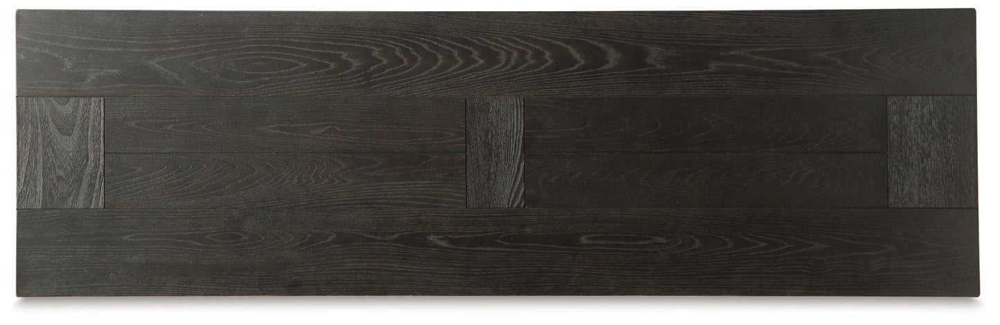 - Rich layered black finish on textured wood grain surface with rubbed-through edges