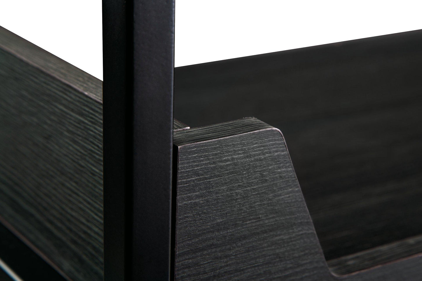 Impress your party guests in style with this bar cart. A blackened effect finish keeps the two tray shelves looking sleek, while a stemware rack holds wine glasses with ease. Smooth-gliding casters offer easy mobility, and a sturdy design with metal rails provides convenient storage of bottles and utensils.