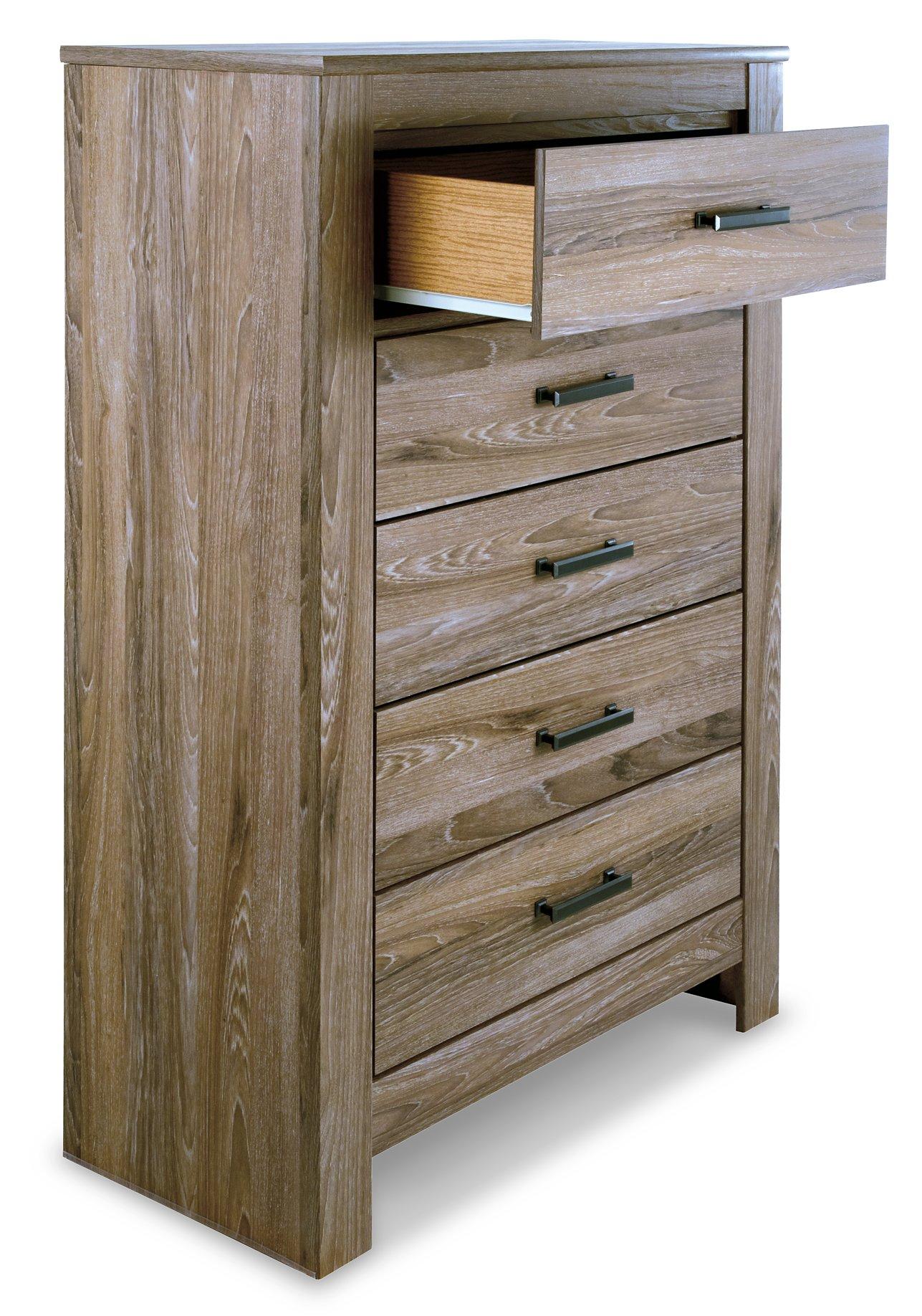 If effortless elegance is the impression you’re going for, this chest of drawers is custom made to fit your space. It’s got the crisp, clean lines of a contemporary piece, but with softly weathered elements, including antiqued industrial pulls and an earthy finish that lets the beauty of replicated oak grain flow through. Five roomy drawers make it a wardrobe storage essential.