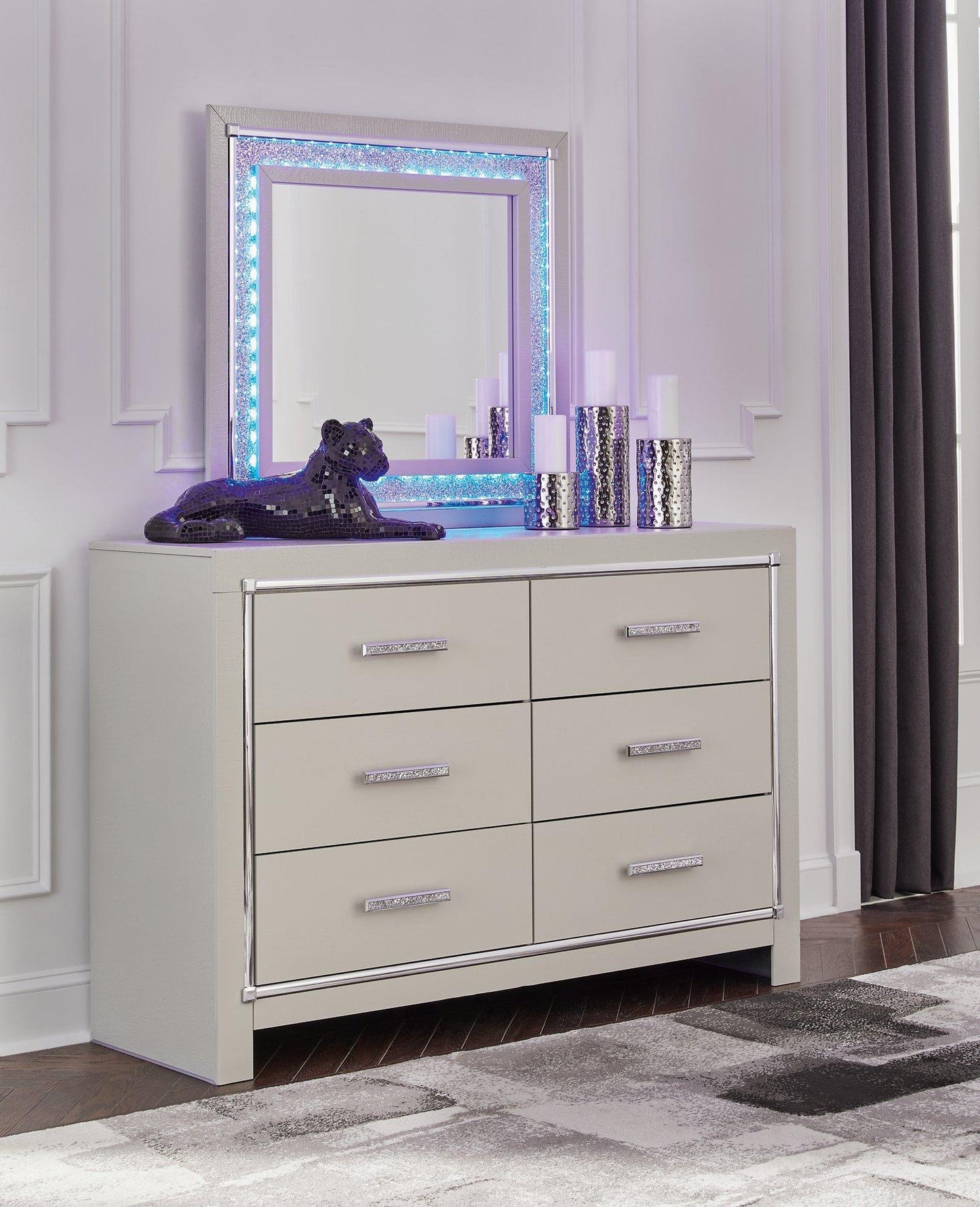Bright, bold luxury. This dresser with mirror dazzles with its attention to detail. Your love of glamorous style is reflected in its all-over faux gator in a metallic finish, exquisitely paired with faceted chrome-tone details. Complete with LED lighting around the mirror, it inspires you to live luxuriously every day—whether dressing up to go out or dressing down to stay in.